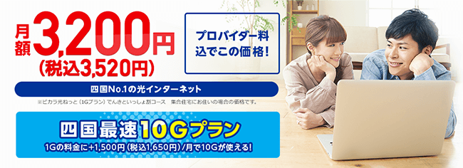 四国のインターネットならピカラ光!17年連続四国No.1の光回線。 最大1Gで月額3,250円~「10Gプラン登場」1G料金+1,650円/月。 ピカラ光なら初期費用が無料+最大30,000円キャッシュバックでさらにお得。 月額500円(税込550円)の光でんわ、アンテナ不要のテレビサービスも充実。四国のケーブルテレビ会社と提携により、豊富なCATVチャンネルをご視聴いただけます。